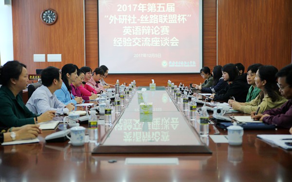 12月5日下午,为庆祝我院学生勇夺第五届外研社•丝路联盟杯大学生英语辩论赛冠军,分享交流参赛经验和心得,进一步促进教学工作,我院在综合楼7楼第一会议室召开第五届外研社•丝路联盟杯大学生英语辩论赛经验交流座谈会。李渝凤院长出席座谈会并讲话。教务处、各系部负责人及专业教师、部分学生参加座谈会。在比赛中获得冠军的英语系王鹏、谢金铭两位同学以及指导教师孙博在会上做参赛情况分享。教务处负责人吴慧华主持座谈会。