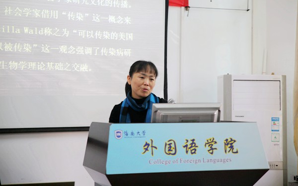 国防科技大学柳晓教授以《美国冷战文化中焦虑文化的塑造:< 天外魔花>的解读》为题作交流发言,指出认知文化研究旨在了解人脑和文化艺术产品这两个错综复杂,具有历史渊源的系统之间不断发展的关系和为了揭示“外在的各种文化、实践是通过人脑内部的运作得到处理和再现,当代认知人类文化学家的研究考察了外部文化是如何与内部思维相联系”等情况。