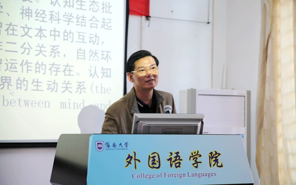 海南师范大学外语学院副院长方志彪副教授以《厄舍府的倒塌》为例,作了“论认知生态批评观”的发言。他介绍,将认知生态批评将生态批评与认知科学神经科学结合起来,论证环境与人类心智在文本中的互动,其核心是自然与人类并非二类关系,自然环境、意象背后都有人心智运作的存在,认知生态批评论的心智世界的生动关系。认知科学和进化心理学与文学研究的所有方面有关,人类所有的活动都有人类心智作为支撑,要理解环境与其表征,必须通过认知机制来完成。