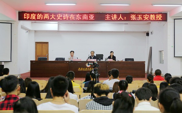 12月5日下午,北京大学博士生导师张玉安教授受邀莅临我院,在图书馆多功能报告厅给师生作题为“印度的两大史诗在东南亚”的专题讲座。李渝凤院长出席讲座,并向张玉安教授颁发我院客座教授聘书。杨学前副院长主持讲座。全体教师、机关教辅管理人员和东语系部分学生聆听了讲座。