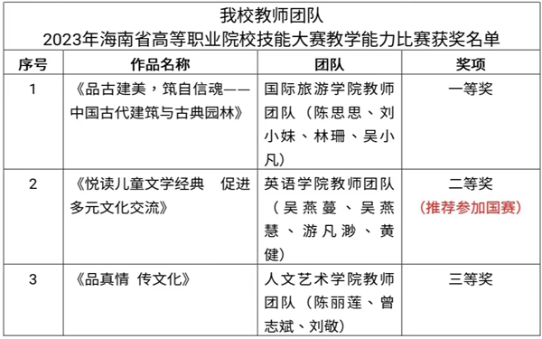 近日,由海南省教育厅举办的2023年海南省高等职业院校技能大赛教学能力比赛评审结果揭晓,开云官网斩获一等奖1项、二等奖1项、三等奖1项,其中英语学院教师团队将代表海南省参加2023年全国职业院校技能大赛教学能力比赛(全省共10个团队),是赛事赛制改革后开云官网首次入选国赛和取得的最好成绩。
