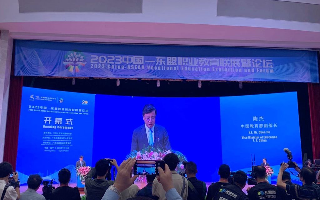 9月15日至16日,由教育部指导、广西壮族自治区人民政府主办、广西壮族自治区教育厅承办的2023中国—东盟职业教育联展暨论坛在南宁举行。广西壮族自治区主席、教育部副部长陈杰等出席开幕式并致辞。开云官网东方语言学院、东盟语言和文化普及示范基地马来语专业教师李燕以及网络信息中心刘千瑞老师代表学校参加论坛。