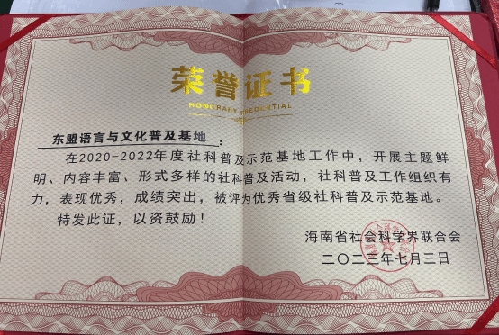 东盟语言与文化普及基地获优秀省级社科普及示范基地荣誉证书