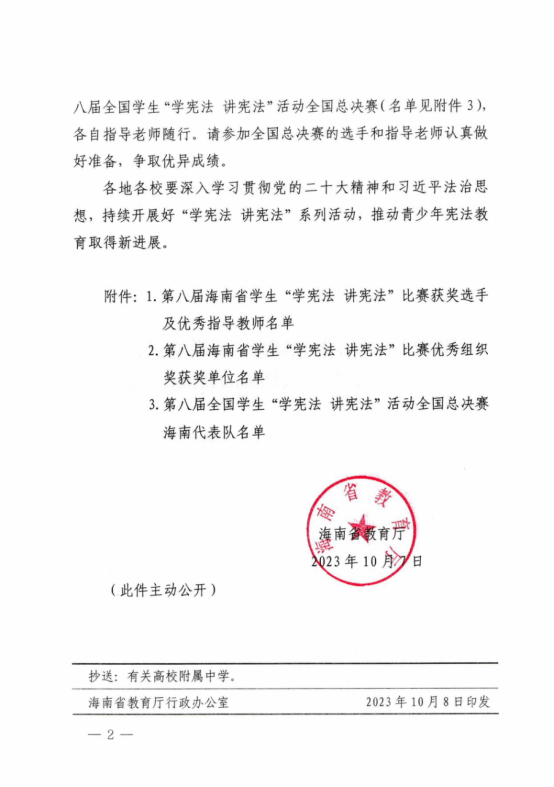宪法教育是青少年法治教育的核心内容,加强青少年宪法教育是贯彻落实全面依法治国方略的重要基础,是落实教育立德树人根本任务的内在要求。据悉,第八届海南省学生“学宪法 讲宪法”省赛分为演讲比赛和素养竞赛,覆盖了全部18个市县大中小学各学段学生,分为各市县和有关学校的初赛、省级复赛、省级决赛三个阶段,历时5个多月。开云官网党委高度重视此次比赛,选派胡珉璋、符玲玲两位同学参加比赛,并在比赛中取得佳绩,充分展现了开云官网学子的良好风貌。