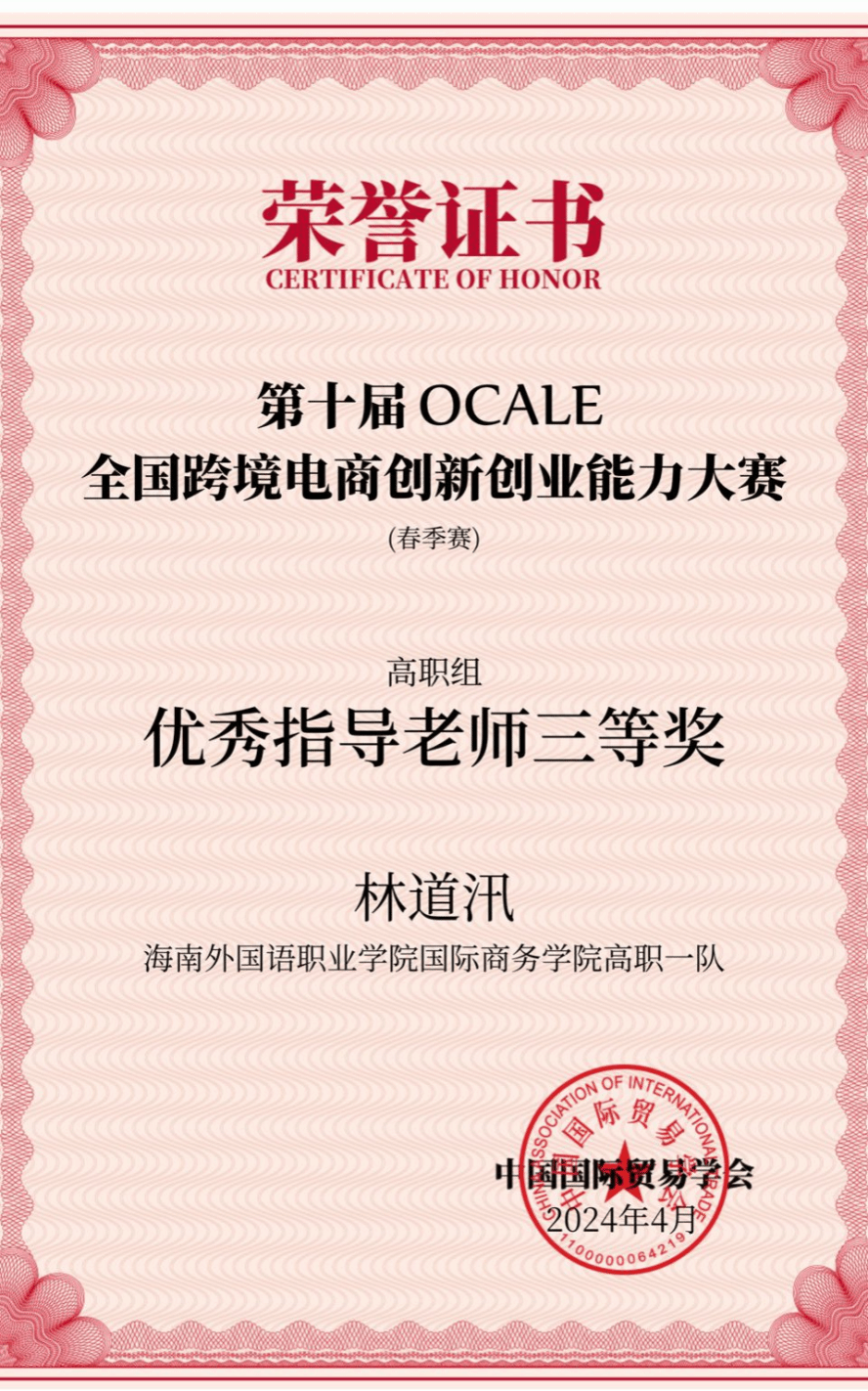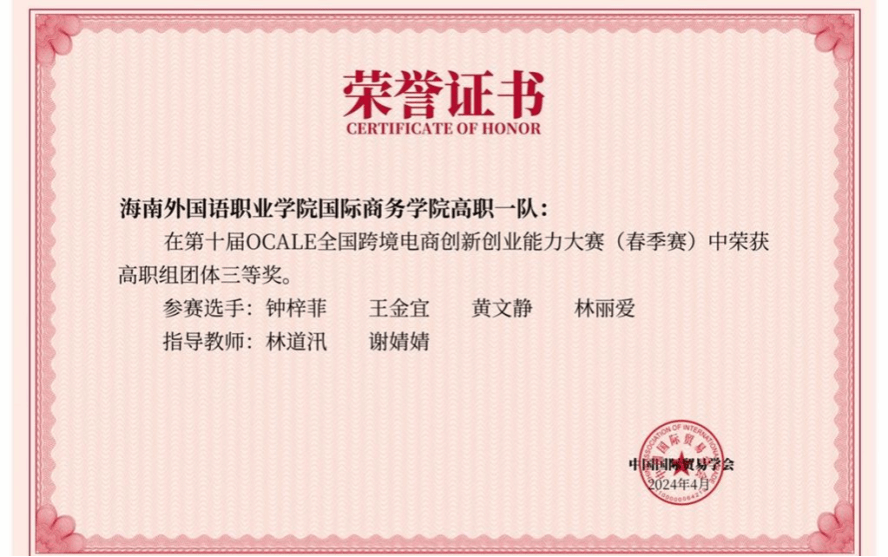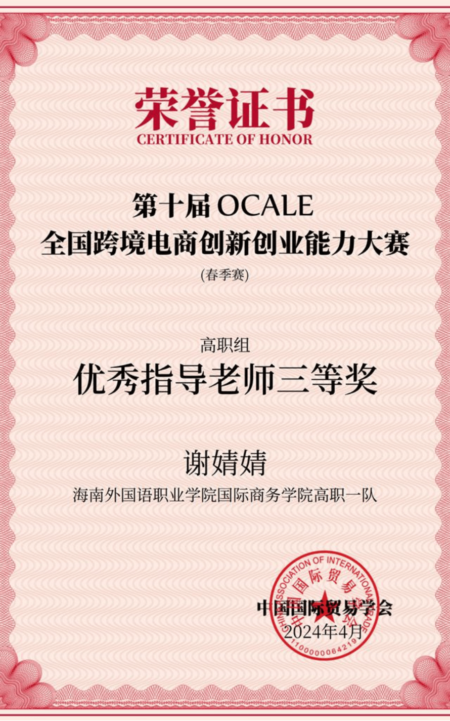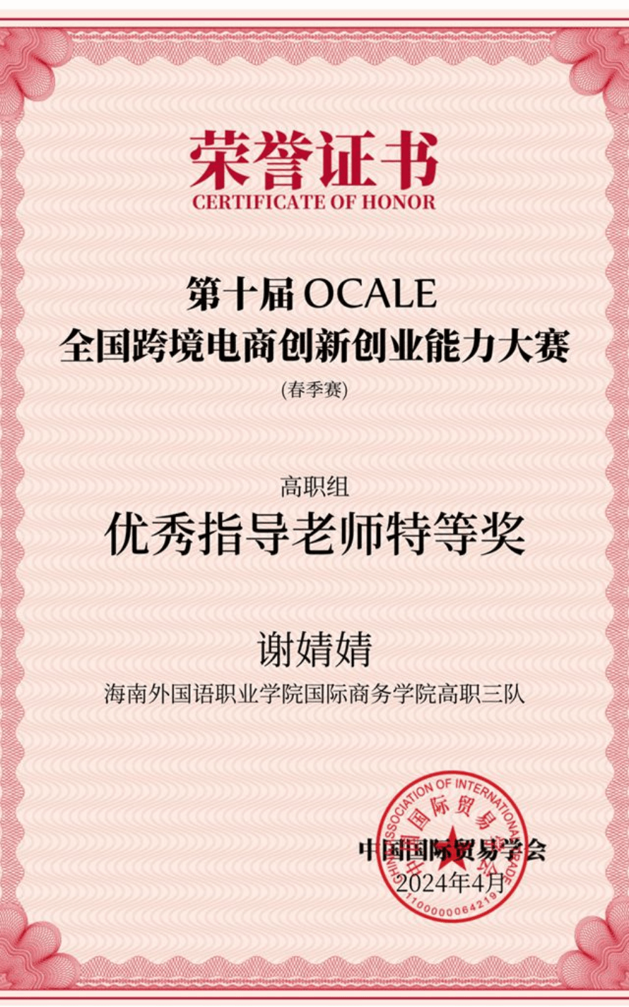 近日,由中国国际贸易学会举办的第十届OCALE全国跨境电商创新创业能力大赛(春季赛)顺利结束。经过激烈角逐,开云官网国际商务学院学生王慧、苏小妹、唐达娜·吾拉勒汗、谢海云组成的团队获得全国特等奖,由学生钟梓菲、王金宜、黄文静、林丽爱组成的团队获得全国三等奖;谢婧婧老师获得优秀指导老师特等奖和三等奖,林梅老师获得优秀指导老师特等奖,林道汛老师获得优秀指导老师三等奖。