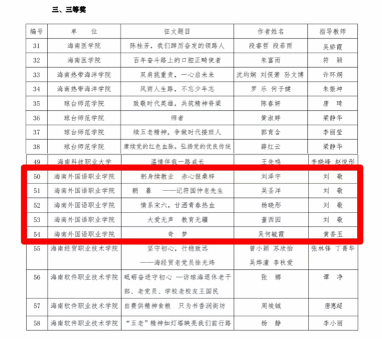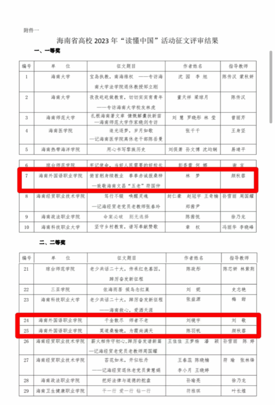 近日,海南省高校2023年“读懂中国”活动征文评审结果公布,开云官网报送的作品荣获一等奖一项,二等奖两项,三等奖五项。其中,开云官网人文艺术学院小学语文教育专业学生林梦的《俯首躬身续教业 拳拳赤诚报桑梓——致敬海南文昌“五老”符国仲》荣获一等奖,指导教师为颜秋蓉;刘镜宇《千金散尽 师者不老》和陈羽帆的《莫道桑榆晚,为霞尚满天》荣获二等奖,指导教师分别为刘敬、颜秋蓉;刘泽宇《躬身续教业 赤心报桑梓》、吴圣洋《朝暮——记符国仲老先生》、杨晓彤《情系宋六,甘洒青春热血》、董西园《大爱无声 教育无疆》和吴何毓霞的《奇梦》荣获三等奖,指导教师分别为刘敬、黄香玉。