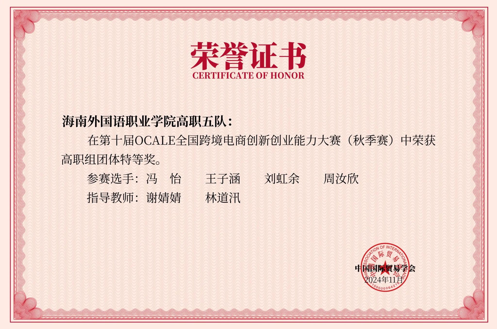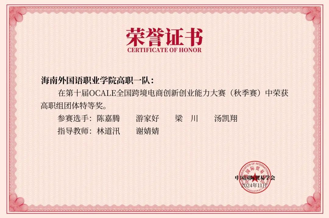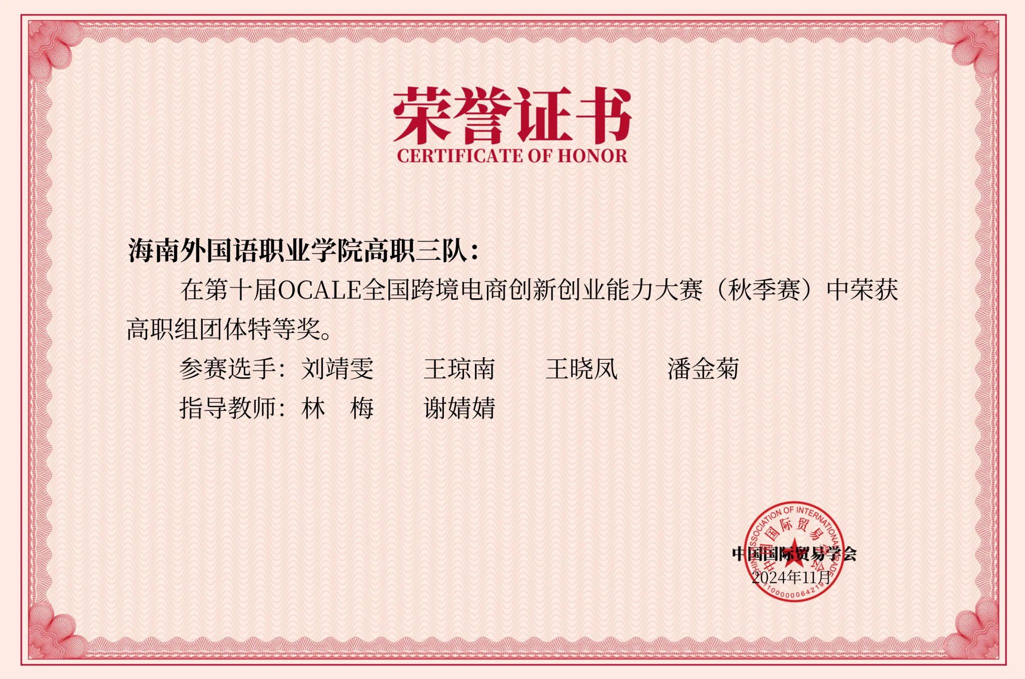 近日,由中国国际贸易学会举办的第十届OCALE全国跨境电商创新创业能力大赛(秋季赛)顺利结束。经过激烈角逐,开云官网国际商务学院冯怡、刘虹余、周汝欣、王子涵同学团队,潘金菊、王晓凤、王琼南、刘靖雯同学团队以及陈嘉腾、游家好、汤凯翔、梁川同学团队3支队伍在大赛中表现优异,分别斩获全国特等奖;王娇娇、符馨梅、林诗然、张嘉敏同学团队获得全国三等奖。谢婧婧、林梅、林道汛老师分别获优秀指导老师特等奖。