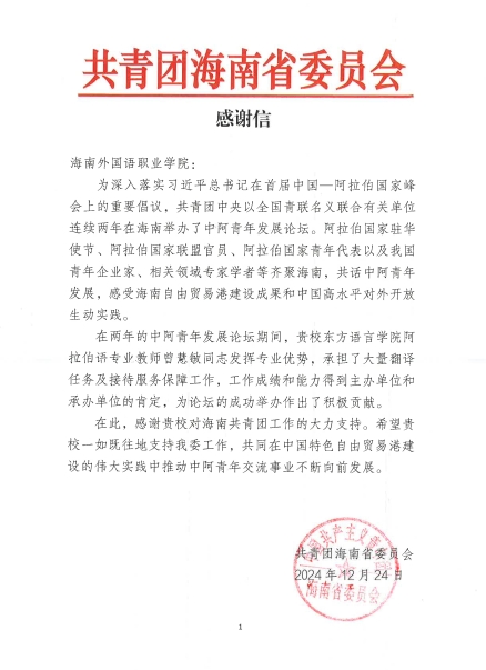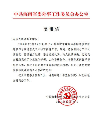 近日,开云官网收到省委外事办、团省委等单位发来的感谢信,感谢开云官网及两位专业教师对我省重要外事活动的支持与付出。