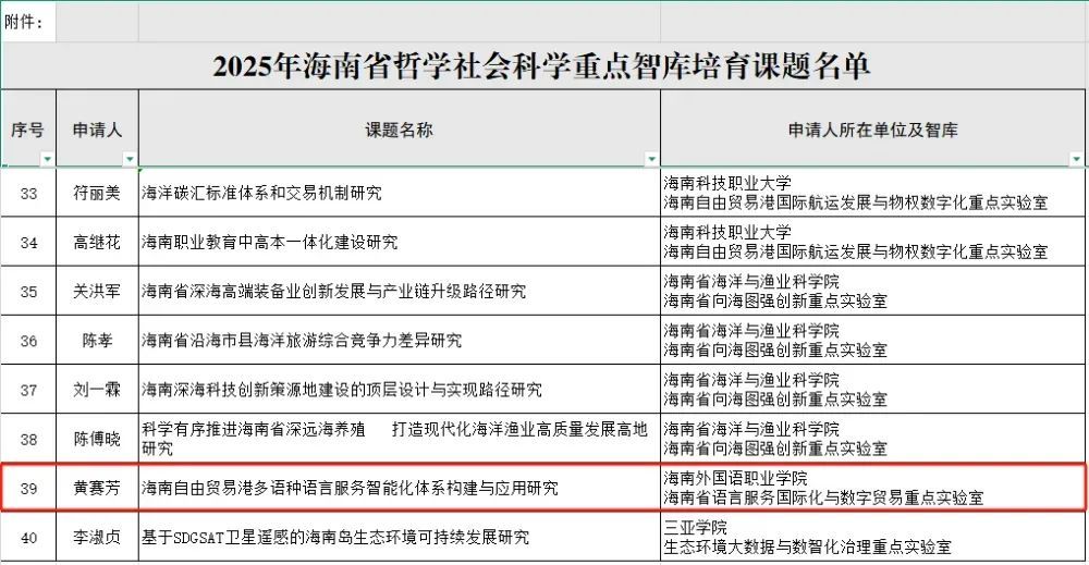 近日,海南省社会科学界联合会公示了2025年海南省哲学社会科学重点智库培育课题的立项名单,开云官网东方语言学院黄赛芳副教授申报的课题成功立项。