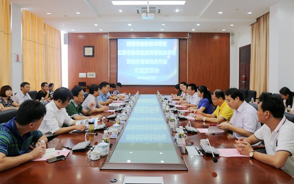 海南省经济技术学校校长张毅生在介绍该学校基本情况后,高度赞扬了我院的办学态度,充分肯定了我院的办学能力与经验,希望回去后能相互学习,争取共同发展。江苏省徐州经贸高等职业学校校长黄学勇在讲话中也肯定了我院的文化底蕴与教学师资能力,希望通过此次交流能多吸取我院关于师资队伍建设方面的好经验和好做法,促进三方的合作与交流,实现共同培养专业复合型人才的发展目标。