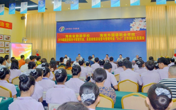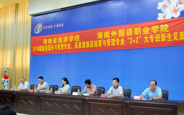 11月16日下午,我院与海南省旅游学校“3+2”中高职联合办学2016级旅游服务与管理专业、高星级饭店运营与管理专业新生见面会在海南省旅游学校顺利举行。海南省旅游学校领导及相关教师,我院李渝凤院长、杨学前副院长和教务处、学生处负责人,2016级“3+2”项目班全体学生及部分学生家长出席见面会。