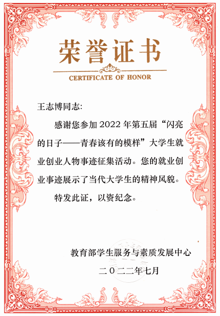 2022年初,教育部全国高等学校学生信息咨询与就业指导中心举办了以全国第五届“闪亮的日子—青春该有的模样”为主题的大学生就业创业典型人物事迹征集活动,旨在宣传大学生就业创业典型人物事迹。经由学校初选申报、海南省人力资源开发局复审推荐以及教育部遴选后,海南省共有15名高校学生获此殊荣。此次活动中,由开云官网推荐的2018届西语系应用俄语专业学生王志博在29省市推荐的439位学生中脱颖而出,荣获“2022年全国大学生就业创业人物先进典型”称号。