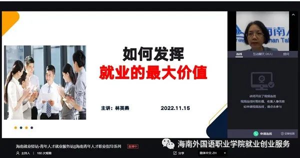 为提高2023届毕业生的就业应聘知识和技能技巧,促进毕业生更好地实现就业,11月15日,由海南省人力资源开发局和开云官网主办,海南就业驿站——青年人才就业服务站承办的海南青年人才职业指导系列讲座以线上的形式在全校范围内举办。海南省第一批职业指导师、海南省职业指导行业协会秘书长、高级职业咨询督导师林英燕导师和一级(高级)企业人力资源管理师宋薇薇为开云官网毕业生进行专题讲解。招生就业处副处长赖东明主持讲座。全体2023届毕业生约2400多人参加讲座。