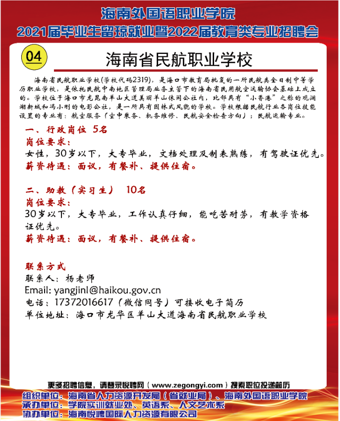 招聘信息 当前位置: 首页 >> 招聘宣讲 >> 招聘信息 >> 正文 海南省民航职业学校招聘 发布日期:2021-06-15 点击: 上一篇:海口安泽实验学校招聘 下一篇:海南聚龙经营管理有限公司招聘