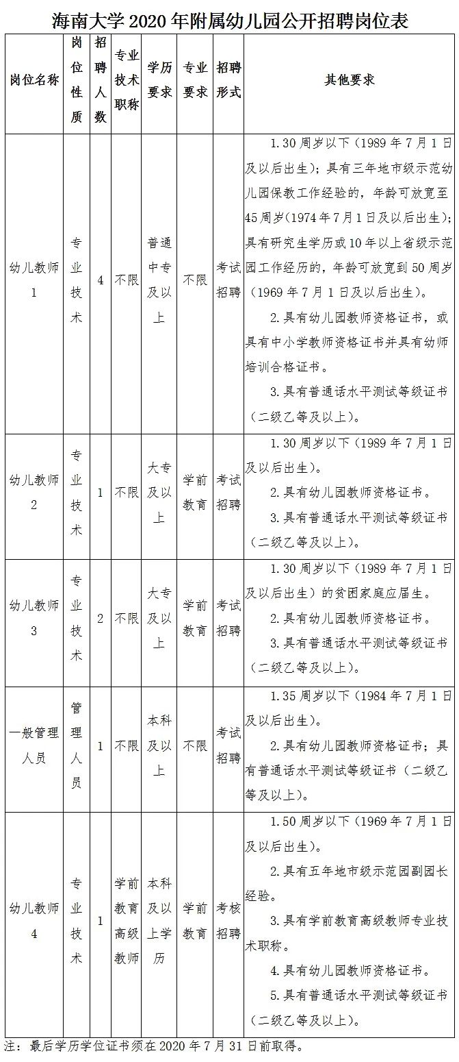 附件:1.海南大学2020年附属幼儿园公开招聘岗位表