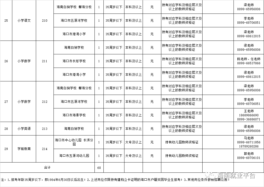 本次面向海口市户籍贫困毕业生为招聘对象的岗位60名。被聘用者为事业单位工作人员,可按有关规定享受海口市人才优惠政策和薪酬待遇。专业技术岗位聘任视学校岗位空缺情况而定。