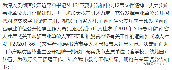 面向海口市户籍贫困毕业生招聘符合此次公开招聘的相关岗位条件要求的人员。其中,应聘人员须在2020年7月31日前取得岗位条件要求的国家承认学历的毕业证、学位证及教师资格证书。未在规定时间内取得并提供有关证书的,视为应聘人员自动放弃,责任自负。