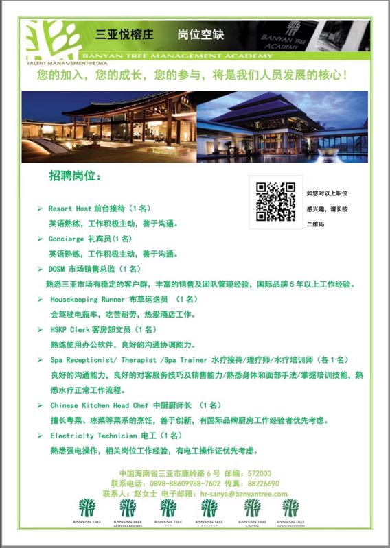 招聘信息 当前位置: 首页 >> 招聘宣讲 >> 招聘信息 >> 正文 海南三亚悦榕庄招聘简章 发布日期:2019-03-07 点击: (温馨提示:招聘公司地址仅以本网站为准,请同学们面试时注意核对。) 上一篇:三亚丽禾温德姆酒店招聘简章 下一篇:文昌鲁能希尔顿酒店招聘简章