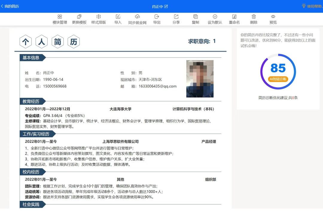 根据智能诊断提出的优化建议再进行二次的简历优化和诊断