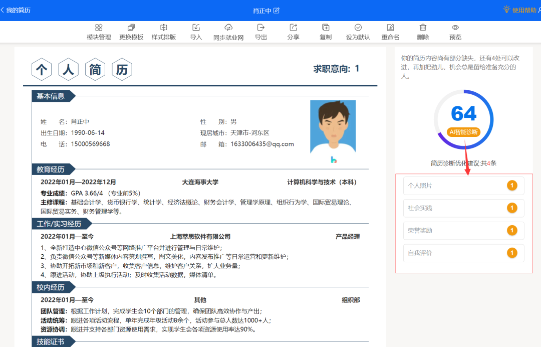 3.智能诊断:制作完成后,通过AI检测简历内容,自动诊断问题点,提示逐项优化,根据系统建议,优化简历即可。