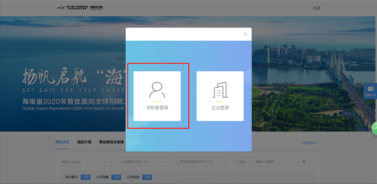 完成注册/登录后,跳转至主页面,并点击【求职者登录】