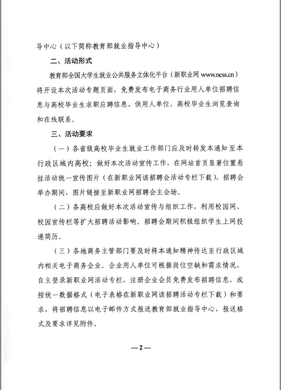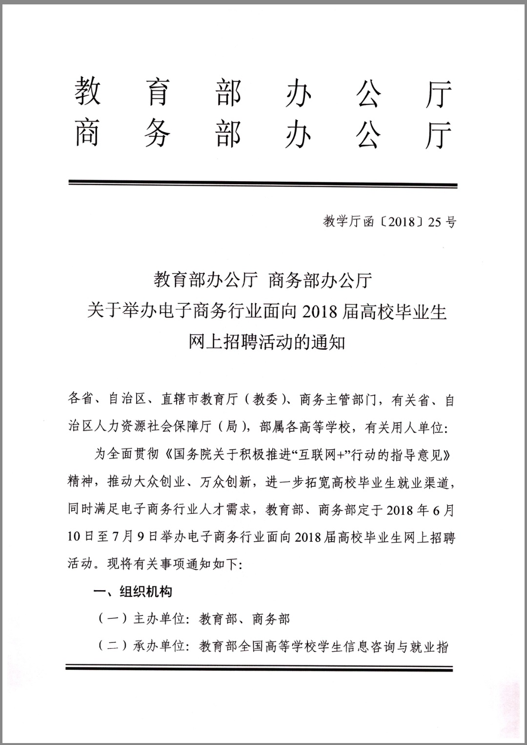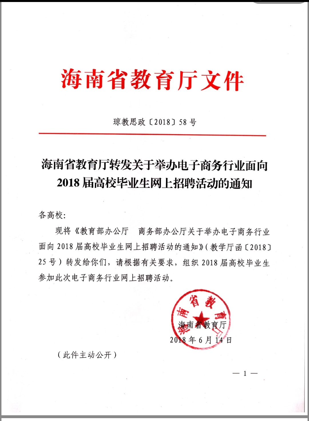 通知公告 当前位置: 首页 >> 通知公告 >> 正文 海南省教育厅转发关于举办电子商务行业面向2018届高校毕业生网上招聘活动的通知 发布日期:2018-06-21 点击: 上一篇:开云kaiyun登录入口 英语系2018届毕业生、 国际商务系2019届电子商务专业实习生 专场招聘会招聘单位名单汇总 下一篇:青年国际实习交流计划资助流程方案