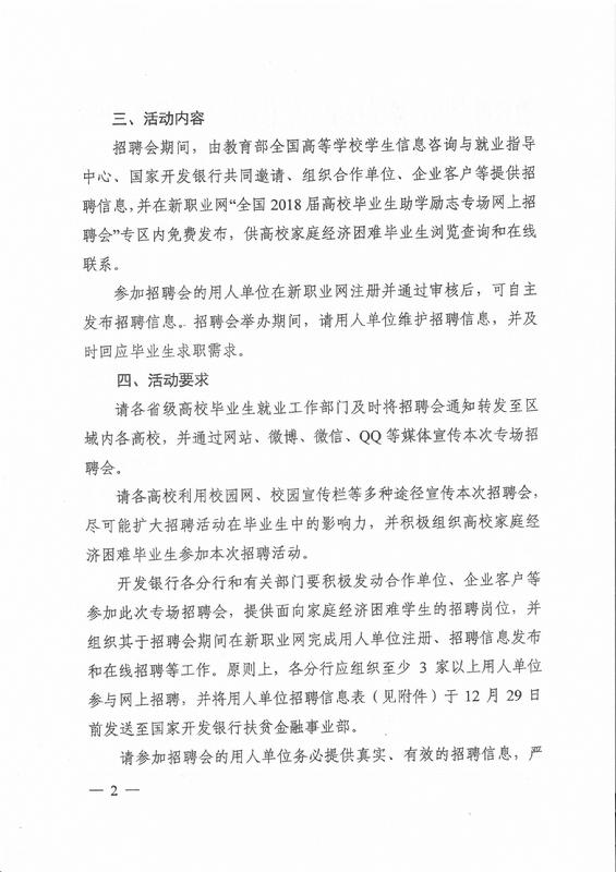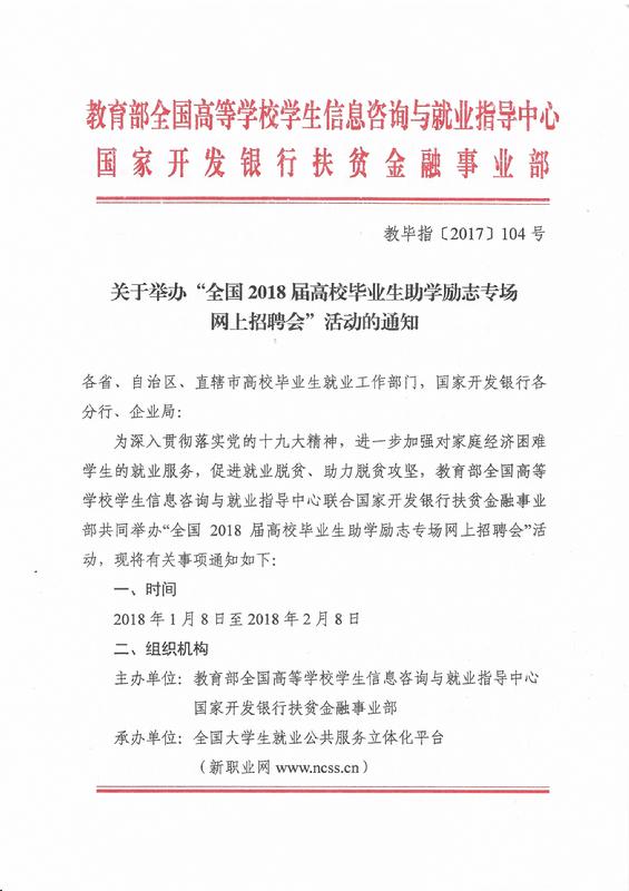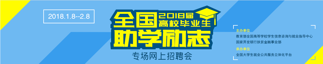 通知公告 当前位置: 首页 >> 通知公告 >> 正文 关于举办“全国2018届高校毕业生助学励志专场网上招聘会”活动的通知 发布日期:2018-01-12 点击: 时间:2018年1月8日——2018年2月8日 网址:http://www.ncss.org.cn/wlzph/zxlzzph/ 上一篇:2018届毕业生求职知识讲座 下一篇:第五届春季活动海南省现场招聘会场次汇总表