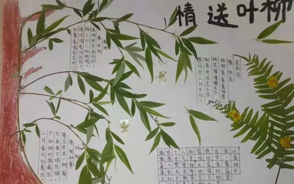 还有的同学用电脑绘出了自己想象中的“青草池塘处处蛙”的美丽景象。正逢清明时,还有的同学,用柳叶制作了一张手抄报,寄去对家人的思念。