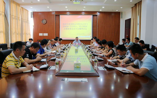 会上,省教育厅副厅长、主持学院党委全面工作负责人邢孔政传达学习了习近平总书记在“不忘初心、牢记使命”主题教育工作会议上的重要讲话精神,原原本本传达了省委书记刘赐贵、“不忘初心、牢记使命”主题教育中央第九指导组副组长朱先奇在海南省“不忘初心、牢记使命”主题教育动员大会上的讲话。
