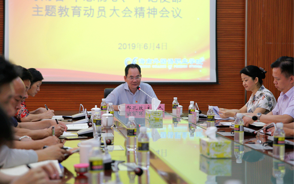 6月4日上午,我院在综合楼7楼第一会议室召开专题会议,传达学习海南省“不忘初心、牢记使命”主题教育动员大会精神。省教育厅副厅长、主持学院党委全面工作负责人邢孔政主持会议并讲话。院长李渝凤,党委副书记、纪委书记徐畅,副院长杨学前,党委委员梁松出席会议。各部门、各系部主要负责人参加会议。