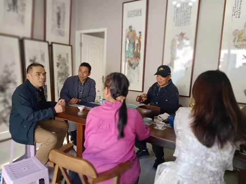 图为陈海圣院长与久阳书画工作室的画家们在座谈交流