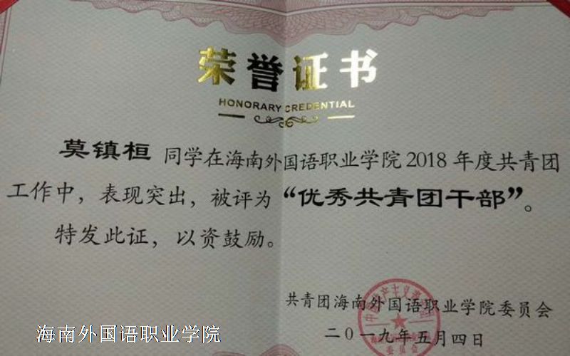 莫镇桓同学在纪念五四运动100周年活动获得“优秀共青团干部”称号