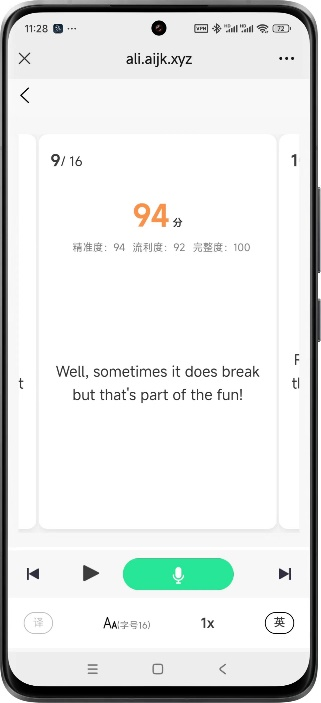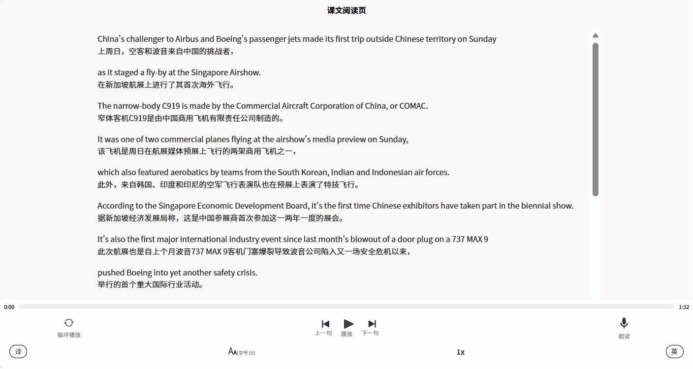 可直接点击课程进入课程阅读页面,点击右下方朗读进入跟读学习,完成朗读后评分系统会根据三个维度进行打分。