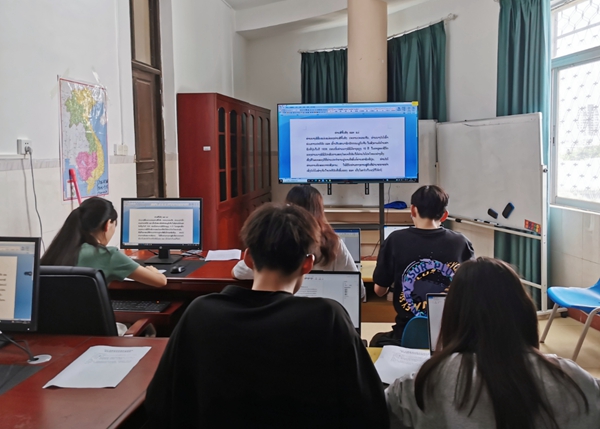 活动开始,李妮老师检查了同学们电脑设备的准备情况后宣读了比赛规则,要求同学们在规定时间内完成《习近平和母亲》老挝语文章的电脑输入与排版。主持人宣布比赛正式开始的话音刚落下,教室里就响起了此起彼伏敲击键盘的声音,一场指尖上的较量正式开始。同学们边认真阅读文章内容,边快速地敲击着手中的键盘,现场氛围十分热烈。有的同学边打字边排版,有的同学一鼓作气打完字再排版。随着时间一分一秒地流逝,主持人宣布比赛结束,同学们迅速保存好Word和PDF文档提交给评委老师。随后,李妮老师对《习近平和母亲》文章故事进行了生动讲解。