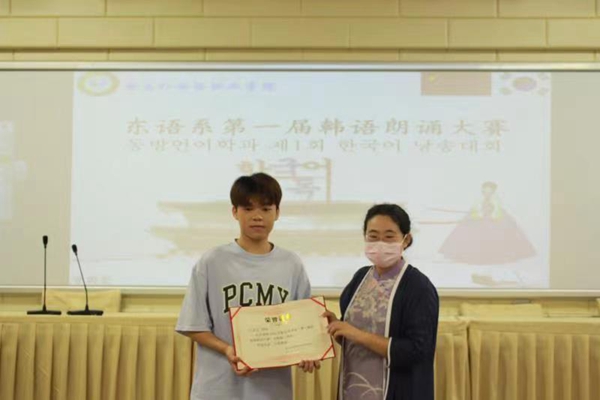 为了进一步激发同学们学习韩语的兴趣,提高同学们的韩语视、听、说及韩语诗歌朗诵能力,同时检验同学们韩语学习成果,给同学们提供一个培养自信、表现自我的舞台,应用韩语专业于2022年5月11日早上在综合楼AE101教室举行了职业活动周系列之“东语系第一届韩语朗诵大赛”。此次比赛的参赛选手为21级应用韩语班的学生,担任此次大赛的评委老师有韩语教研室主任金焱老师、李振中老师、姚然老师、郭海燕老师、李耕百老师、宋艳冰老师、符向锋老师、以及韩国外教苏一权老师。