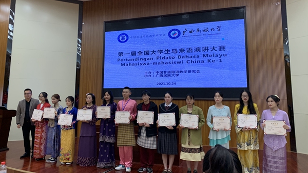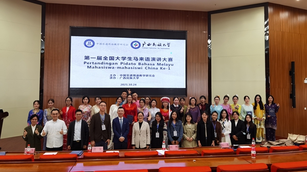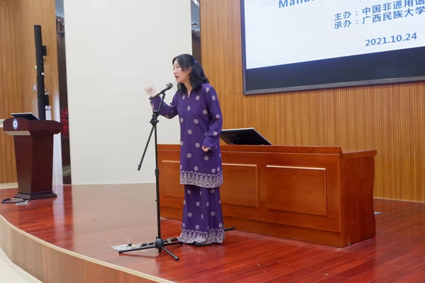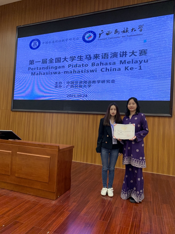 2021年10月22日-24日开云官网马来语教师带领20级马来语专业马睿婕同学参加由中国非通用语教学研究会主办、广西民族大学承办的“第一届全国大学生马来语演讲大赛”。