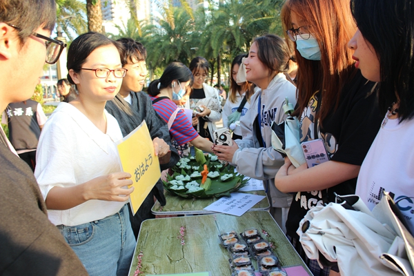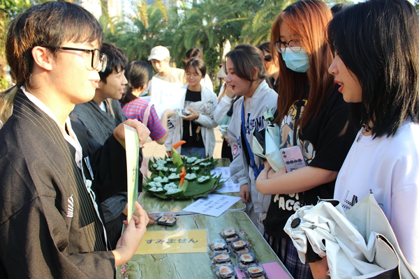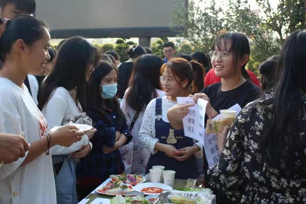 活动未开始时就有许多同学和市民来到此地,带着好奇心来欣赏各专业制作的美食。活动开始,首先各专业的同学开始宣传传统美食文化,其次是以教大家学习最基础的外国语言来领取该国的特色美食,大家都沉寂在品尝美食的欢乐中方,大家相互畅谈学习心得与饮食感受。