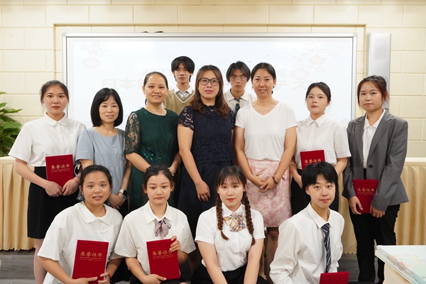 在这里,还需要感谢幕后默默工作的志愿者们,他们是来自19级商日1班的李艳、赵雪莹、廖封俊、李佳敏和主持人薛国昊、蔡紫荧共6位同学。
