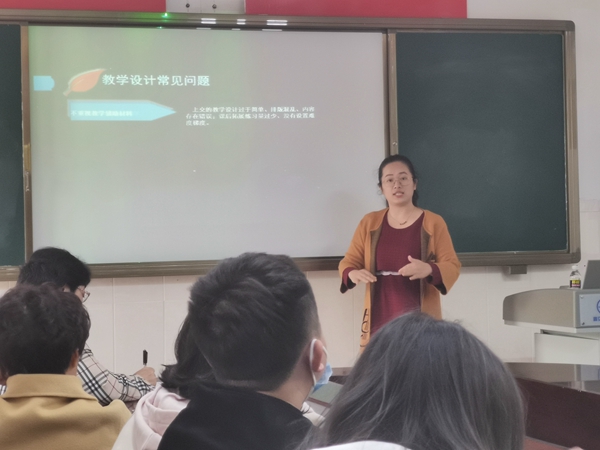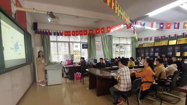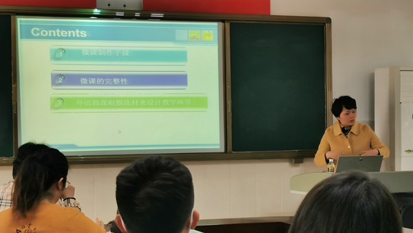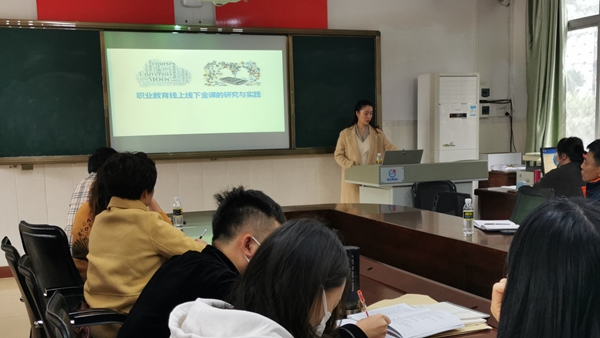 刚参加完全省金课培训的东语系郭海燕老师首先围绕“在职业教育改革中金课是如何发展起来的?”“职业教育在线开放课程如何建设?”“职业教育在线开放课程建设过程中需要注意的问题”等方面,分享了培训学习心得。