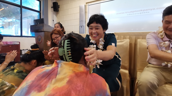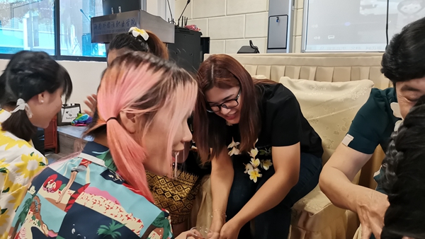 在“行滴水礼”环节中,同学们排着整齐的队伍,依次俯身走到7位老师面前,以跪姿将手中杯子里芳香的净水轻洒在老师们的手中,随后分别向老师们献上各自的祝福以示感恩及尊敬。老师们在接受同学们的洒水和祝福时,用沾有芳香净水的双手轻轻抚摸同学们的额头及脸颊,回赠予大家满满的祝福。部分同学们感叹到:“自己从来没有去过泰国,更不知道泰国的文化色彩,没想到有一天我可以通过泰语专业举办的宋干节活动,去了解东南亚的文化色彩,仿佛身临其境了一样!”