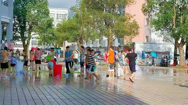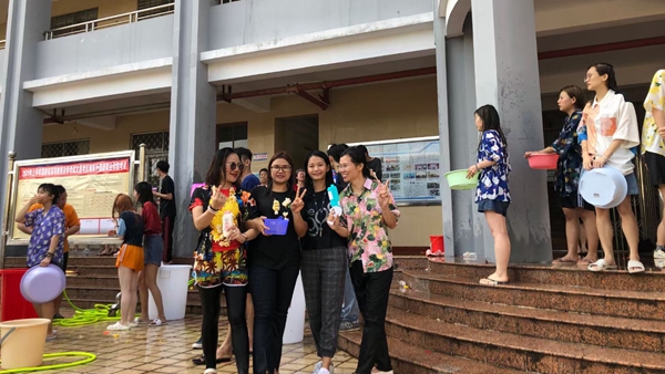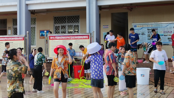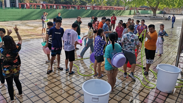 开幕式结束后,同学们一起参与了拔河比赛及泰国传统游戏 。随后大家期待已久的泼水环节正式开始了!同学们来到2号教学楼前的广场,不同专业的同学纷纷融入其中,现场的同学们互相泼水表达祝福,你追我赶,尽情释放着欢乐。大家不分年龄、不论男女,锅、碗、瓢、盆、大水枪,能盛水、能用上的全都发挥了作用,尽情“撒水狂欢”。很多在场的同学们笑着闹着说:“第一次看学校办这种活动,也是第一次知道‘宋干节’,不仅玩儿得开心,还学习了泰国以其他3国的文化,希望以后每一年都能举办,我们还要参加!”此时此刻,来自不同专业的老师和同学们共同分享着节日欢愉与友谊的美好及吉祥如意的祝福!