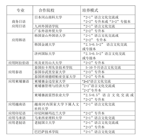 东语系10个语言专业均有与国内外建立的合作院校,开拓了多元化的升学深造渠道。实行“2.5+0.5”“2+1”“2+2”等多层次办学模式,为学生提供实习、实训锻炼基地,为专升本创造条件,搭建平台。