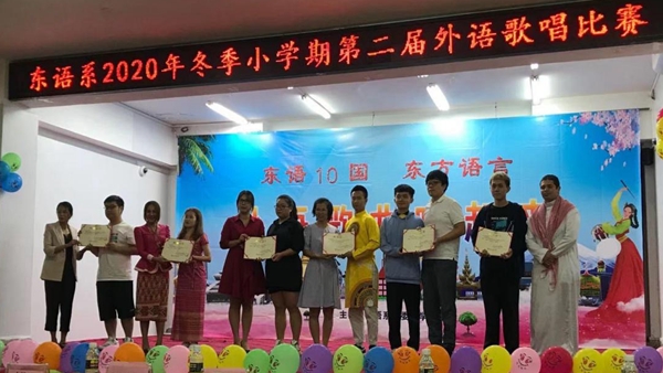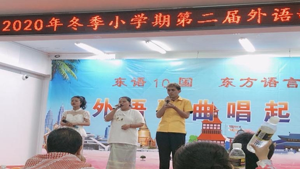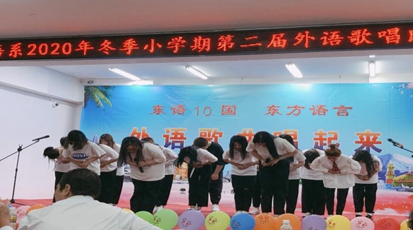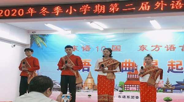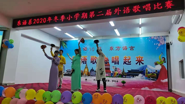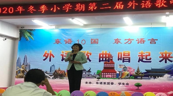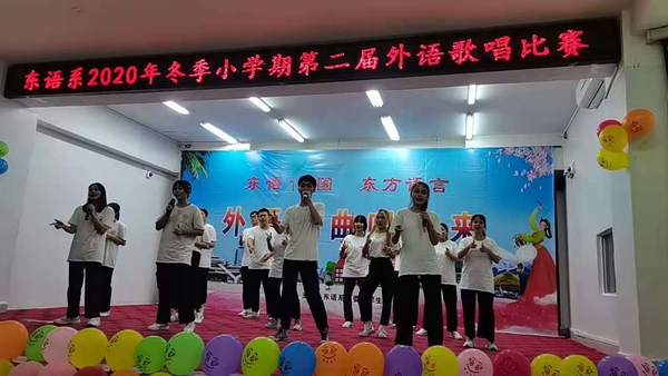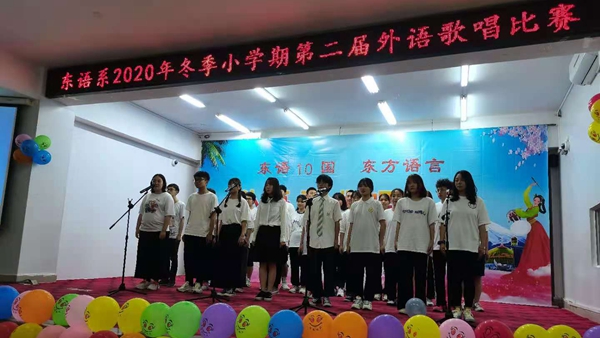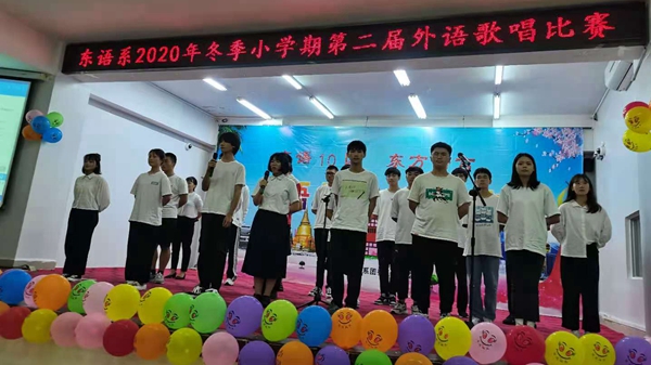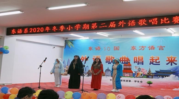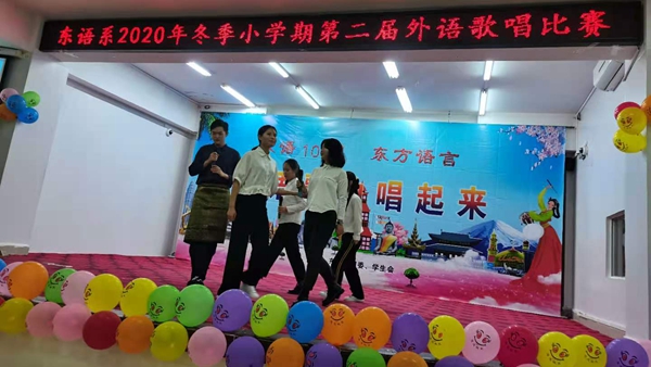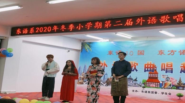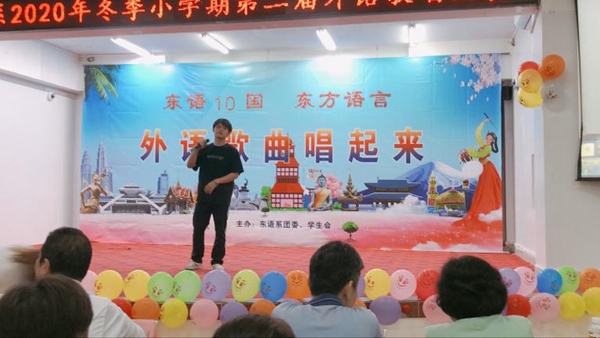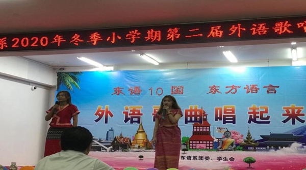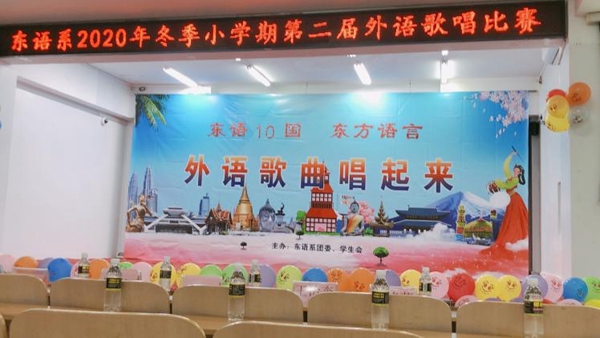 以“外语歌曲唱起来”为主题的东语系2020年第二届外语歌曲比赛于11月24日晚八时在多功能报告厅举行。