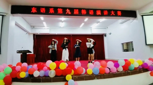 比赛前的开场舞是由19应韩的同学们为大家表演的《扇子舞》。在六位同学优雅的舞姿下,第九届韩语演讲比赛拉开了帷幕。由16应韩(501)班,16应韩(502)班及18应韩班的同学组成的九位参赛选手开始了紧张激烈的比赛。第一轮环节为主题演讲。演讲主题多彩多样,各色各异。既有贴近生活的兼职经历、火锅体验,也有诗意的远方之论、梦想之谈。九位同学在充分准备的情况下各有千秋,表现的旗鼓相当,为大家带来了十分精彩的演讲。第二环节即兴演讲则十分考验同学们的反应能力,即使是即兴发挥,同学们也凭借着扎实的韩语功底,顺利完成考验。