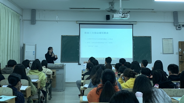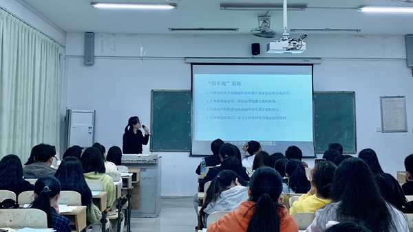会议首先由就业指导工作梁瑜老师向同学们详细介绍了顶岗学习手册、实习三方协议书、就业三方协议等的填写要求,解读首次提出的“四不准原则”。在座的全体同学们认真倾听,随后开始提出问题,梁瑜老师逐个耐心地进行解答。