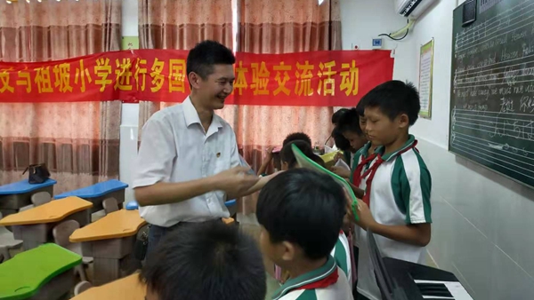 活动最后,党员们到祖坡小学和学生们开展了多国语言交流活动,并送上文具等慰问品。在多国语言交流活动中,党员同志们选择了简单易学的问候语,教学生们用韩语、日语、柬埔寨语、老挝语、阿拉伯语、泰语等说了“你好”、“谢谢”、“再见”等问候语。交流现场,学生们积极学习各种外国语言,一片欢声笑语。通过此次多国语言交流活动,祖坡小学参加活动的学生们亲身体验了外国语言,拓宽了视野,丰富了见闻。