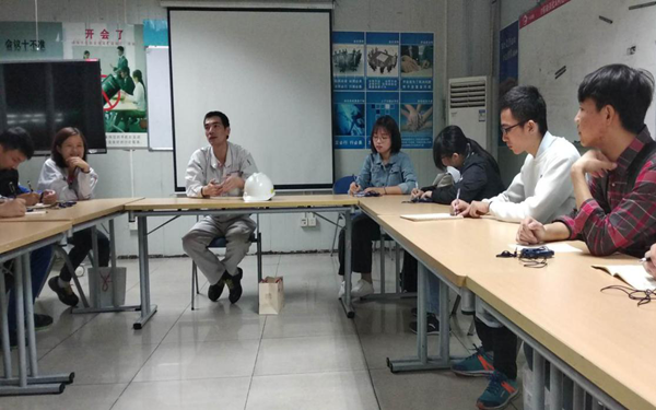 冲压车间系长刘培雄(右一)在为师生介绍车间生产状况