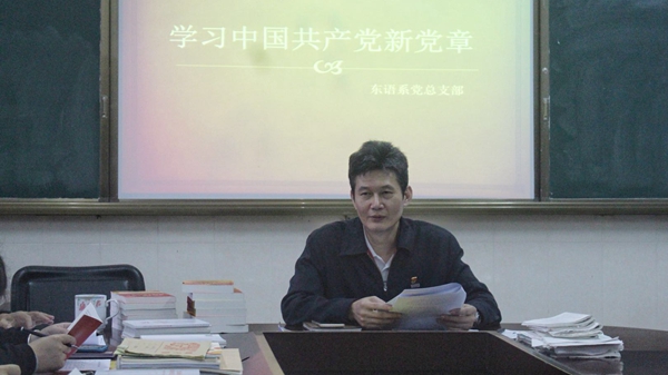 12月14日,东语系在系会议室召开全体师生党员大会,系党总支书记王诒奎带领东语系全体师生教师党员一起学习了十九大修订的新党章。