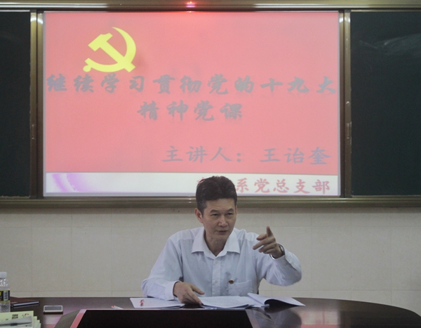 王诒奎还要求,要强化学习,提升学习政治理论知识的实效。将学习十九大会议精神作为当前和今后一个时期首要的政治任务,深刻领会习近平新时代中国特色社会主义思想,要坚持集体学与自学相结合,以中心组学习为主,坚持党总支、党支部“三会一课”制度,多措并举学好十九大精神;要重视作风建设,坚持全面从严治党。一定要高度重视纪律作风建设,特别是对师生反馈的问题要引起反思;要增强责任心,把正风肃纪作为重点来抓。认真落实周二“主题党日”、工作考核小结、汇报制度,各支部召开支部会议进行总结。