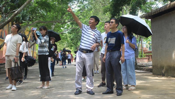 麦总经理为学生以及同期到访的海南省旅游景区协会秘书长苏群(右二)进行讲解
